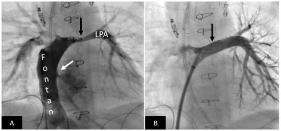 Postoperative left pulmonary artery stenting in a patient with persistent high-volume chest tube output after Fontan procedure. (A) Angiography in the Fontan pathway shows moderately severe long-segment left pulmonary artery stenosis (black arrow). Please note right to left shunt across the fenestration (white arrow). (B) Excellent angiographic result after stent implantation (arrow) resulting in resolution of the high-volume chest tube output. LPA = left pulmonary artery.