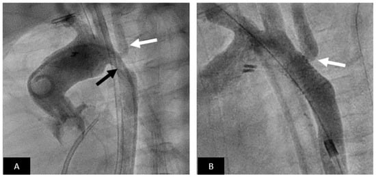 Coarctation stenting. (A) Aortogram in LAO view showing moderate coarctation (black arrow) involving the left subclavian artery (white arrow). (B) Excellent angiographic result following stent implantation without residual gradient. Note that even though the stent jails the left subclavian there is good flow (white arrow).