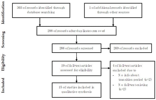 The systematic literature search yielded 304 results. After excluding 16 duplicates, we reviewed 288 articles and excluded 269 based on their title or abstract. Of the 19 full texts reviewed, four were excluded (lack of information on the transition period in two and no full text in two), whereon 15 studies were included in this systematic review [8,9,10,11,12,13,14,15,16,17,18,19,20,21,22] (Figure 1). The included studies consisted of eight reviews [11,12,15,16,17,18,19,21], four interviews/surveys [8,9,20,22], and three case series [10,13,14]. Eight studies discussed PBT patients [10,13,14,15,16,18,19,20], three emphasized on NF1 patients [12,17,22], and four on TSC patients [8,9,11,21].