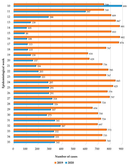 In order to better assess the impact of the COVID-19 pandemic on pediatric pathologies during the initial lockdown period, we analyzed the data starting with the 10th epidemiological week of 2020, considering that the first case of COVID-19 was reported in Romania on 26 February 2020 [20,21], the World Health Organization declared a pandemic on 11 March 2020 [1], and a state of health emergency was declared in Romania on 16 March 2020 [2]. All data were compared with the similar period in the pre-pandemic year 2019.