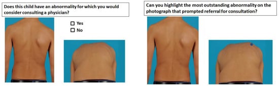 A digital diagnostic assessment was created using QuestManager software (Vital Health). The assessment contained 2 series of 14 slides of photographs (28 slides for the total assessment). Each slide had two photographs of the same child. One photograph was of the back of the child in an upright position, and the other was in Adam’s forward-bending position (Figure 1). All photographs were taken by a medical photographer experienced in the imaging of scoliosis. For the Adam’s bending photographs, the amount of flexion varied for thoracic and lumbar curves to optimize the visualization of the gibbus. The photographs were cropped just below the child’s hairline to protect their privacy. On each slide, the assessors had to answer the following question: “Does this child have an abnormality for which you would consider consulting a physician?”. If this question was answered with a yes, the following question showed up: “Can you highlight the most outstanding abnormality on the photograph that prompted consultation of a physician?”. After the first series of photographs, a slide with information about the signs of scoliosis was shown to educate the parents (Figure 2). The education sheet has not been validated as an educational tool. After reading the information, assessors completed the second part. The second series of photographs were identical to the first part of the survey.