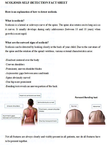 - Spine Society of Australia. The Self-Detection Fact Sheet. Available online: https://www.scoliosis-australia.org/wp-content/uploads/Self-Detection_FactSheet.pdf (accessed on 4 February 2021).