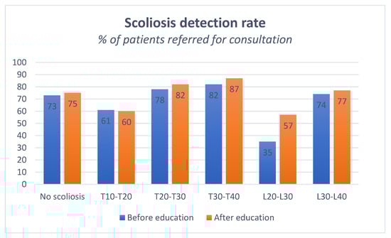 Due to the shifted responsibility of scoliosis detection, the characteristics of AIS patients in the orthopedic clinic have changed [,,,,]. More patients visit the clinic in a later stage with larger curvatures. Screening by parents could be a potential strategy to improve scoliosis detection in healthcare systems without professional screening. Melanoma care is an example of another healthcare system where short cognitive education with photographs effectively improves the ability of laypersons to recognize melanoma among benign lesions and proved to be one of the most cost-effective methods to improve melanoma prognosis []. The idea of screening by parents is not new and is already implemented in the ‘National Self-Detection Program’ of the Spine Society of Australia []. This program is based on the distribution of a ‘Self-Detection Fact Sheet’ in schools to educate children and their parents about the signs of scoliosis []. Nevertheless, AIS is still detected relatively late in Australia, despite the implementation of the national self-detection screening program []. Based on our results, the education of parents seems beneficial in improving scoliosis detection. The limited effect of education in this study is not surprising since a previous study by our team showed a difference of 10% in sensitivity using a similar study setup between untrained parents and healthcare professionals []. Education of parents can thus partially decrease the gap in sensitivity of recognizing the deformity compared to healthcare professionals.