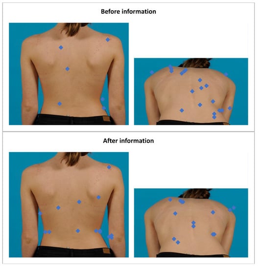 When the assessors recognized an abnormality, they were asked to highlight the most outstanding visual characteristic. Figure 4 visualizes the highlighted areas of the assessors for one of the patients in the diagnostic assessment. The results were quantified by counting the dots in each region (Table 4) for all AIS patients. The most highlighted regions before education were the gibbus (region 5: 195 times highlighted, 24.4%), followed by the waist (region 4: 115 times highlighted, 14.4%) and spine (region 3: 111 times highlighted, 13.9%). After education, the most highlighted regions were still the gibbus (region 5: 201 times highlighted, 25.1%), the waist (region 4: 151 times highlighted, 18.9%), and the spine (region 3: 106 times highlighted, 13.3%). The observed frequencies were not significantly different before and after education (p = 0.707).