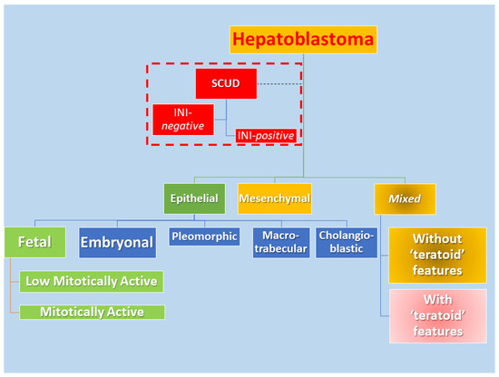 The challenges of a pediatric oncologist facing a liver neoplasm are due to the extreme difficulty of performing biologic studies and large-scale curative trials, despite there being a nationwide consortium of biological researchers and multiple clinical investigators. Hepatoblastoma (HB) is the most customary liver neoplasm in patients aged 18 years or younger, with a rate of one per approximately 1–1.5 million children [1,2]. The most common components of this tumor are epithelial and mesenchymal (Figure 1). In Figure 1, it shows the most common classification of HB used in the United States, Canada, Europe, Asia, Australasia, and Africa.