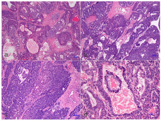 Histology of a mixed hepatoblastoma with teratoid features or teratoid hepatoblastoma showing fetal and embryonal portions and teratoid features with a yolk-sac-like pattern. Cords and solid portions are present and numerous mitoses are recognized with epithelial and mesenchymal components and yolk-sac-like elements (d), ((a–d) hematoxylin and eosin staining, X50 original magnification, scale bar, 100 microns).