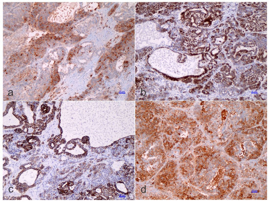Immunohistochemistry of a teratoid hepatoblastoma. The microphotographs show positivity for polyclonal carcino-embryonic antigen (pCEA) ((a), Avidin-Biotin Complex anti-pCEA immunostaining, ×100 original magnification, scale bar, 50 microns), β-catenin ((b), Avidin-Biotin Complex anti-β-catenin immunostaining, ×100 original magnification, scale bar, 50 microns), (cyto-)keratin 19 (CK19) ((c), Avidin-Biotin Complex anti-K19 immunostaining, ×100 original magnification, scale bar, 50 microns), and α-fetoprotein (AFP) ((d), Avidin-Biotin Complex anti-AFP immunostaining, ×100 original magnification, scale bar, 50 microns).