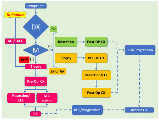 Diagnosis and therapeutic algorithm for hepatoblastoma. Hepatoblastoma is typically diagnosed by objective clinical signs, imaging data, and an increase in serum α-fetoprotein (AFP) levels. In some children affected with hepatoblastoma harboring a tumor, which is identified as ruptured, transarterial embolization (TAE) or transarterial chemoembolization (TACE) is performed to monitor the intraperitoneal hemorrhage. After the hemorrhage is under control, these children should be handled according to the very high-risk stratification flow. Amongst the children without distant tumor spreading [M(−)], low-risk (LR) children are approached with primary resection followed by chemotherapy in the postoperative period (Post-op CX). Standard-risk (SR) (also known as “intermediate-risk” (IR)) or high-risk (HR) children with HB receive chemotherapy in the preoperative period (Pre-op CX). Then, these patients undergo primary tumor resection by hepatectomy or liver transplantation (LTX). The very high-risk (VHR) patients affected by HB and distant tumor spreading (M(+))receive Pre-op CX. Then, a patient whose distant tumor spreading is reduced by CX goes through primary tumor resection by hepatectomy. Alternatively, these patients may undergo LTX, followed by Post-op CX. However, a patient whose distant tumor spreading remains needs to go through “metastasectomy” or hepatectomy. LTX is typically generally for the patient devoid of distant metastasis. On the other side, LTX may be indicated when distant tumor spreading has obviously vanished. Finally, patients with recurrence (RCR) or neoplastic progression should undertake some kind of rescue chemotherapy, also known as salvage CX, which is a form of therapy given after a disease does not react to standard therapy.