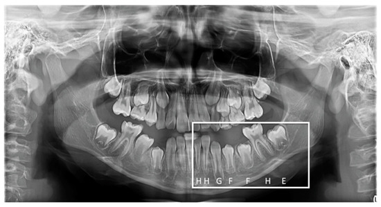 - Roberts, G.; Parekh, S.; Petrie, A.; Lucas, V.S. Dental age assessment (DAA): A simple method for children and emerging adults. Br. Dent. J. 2008, 204, E7. [Google Scholar] [CrossRef][Green Version]