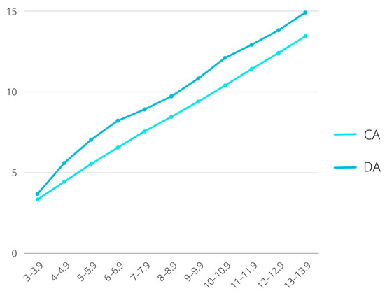 | Age Group (in Years) | CA with SD (in Years) | DA with SD (in Years) | CA-DA with SD (in Years) | p * |