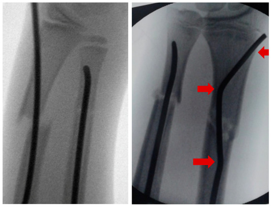 Scheme 4), leaving the fracture of the ulna to spontaneous healing and correction. This was because the risk of osteomyelitis due to intramedullary nailing of the open ulnar fracture to achieve a “nice X-ray” was estimated to be much higher than the risk of a remaining misalignment. Even a redo-procedure of a fracture that we had seen for the first time 4 weeks after an unacceptable K-wire osteosynthesis was successful, this time using a modification of the technique with a bend, rather than a kink distal to the fracture. Please note that the pre-bent nail pushed the 4-week-old fracture into a correct position without open reduction (