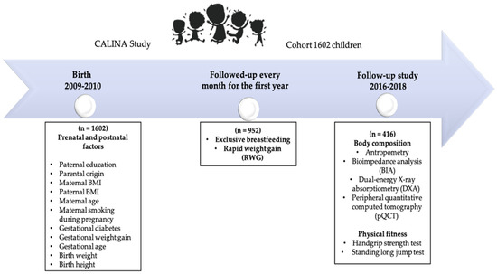 The participants in this study are part of the CALINA (Growth and feeding during infancy and early childhood in children of Aragon) longitudinal observational study involving a representative cohort of children born in Aragon (Spain) between 2009 and 2010. The first sample included 1602 newborns [32], followed-up monthly for the first year and then yearly until the ages of six to eight. From 2016 to 2017, the families initially recruited in Zaragoza-Aragon (n = 952) from the baseline examination were invited to participate in this follow-up study. Four hundred and sixteen of the 952 families agreed to their children’s participation in this body composition evaluation in the laboratory of the University of Zaragoza when the children were between the ages of six and eight. The measures and timepoints collected in these analyses are presented in Figure 1.