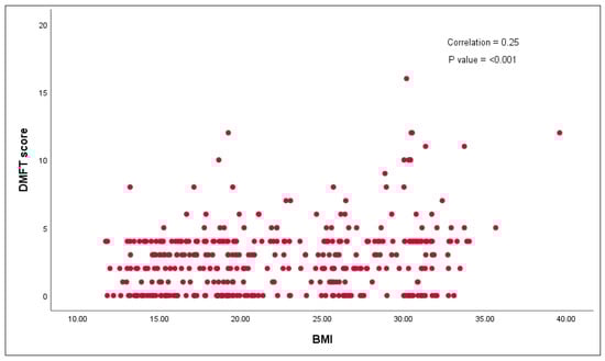 The authors hypothesized a positive association between BMI and dental caries in 6–12-year-old children, and found a significant relationship between them. The present study findings revealed that BMI is one of the predicting factors for dental caries, and vice versa. As BMI is a sign of health, it is a valuable instrument to determine a person’s health. For the vast majority of the population, a normal BMI range is 18.5 to 24.9. The BMI scale is one of the nutritional screening or assessment tools used for screening malnutrition. Underweight individuals have a BMI of 18.5 or lower, which is interchangeable with malnutrition []. Prior studies [,] have shown that dental caries in primary dentition have an association with malnutrition during childhood; however, malnutrition in permanent dentition has not been reported in the published literature among Arabian children. Hypoplasia of enamel [], hypofunction of salivary glands [,] and altered composition of saliva [] are the effects of malnutrition, resulting in increased dental caries, but these individual effects are beyond our study.