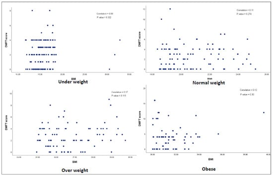 Figure 1 There is evidence to show that a positive association (r = 0.25) between overall scores of BMI and DMFT and statistical significance was evident (p < 0.05). Figure 2 explains the association based on gender and BMI status. There was no evidence of a statistically significant association between BMI status and DMFT among various BMI groups, including underweight, normal weight, overweight and obese children. All the comparisons are illustrated in Figure 2.