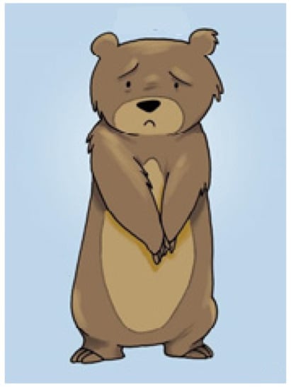 - The siblings selected an unlimited number of images from the Bear cards. This tool was developed in Australia and consists of cards illustrating different emotions, e.g., anger, sadness, happiness, etc. [15] (Figure 2). The Bear cards were used to describe the siblings’ feelings about being a sibling of a child with palliative care needs or about any special event in their life. They were asked to choose images that either mirrored how they usually feel or help them talk about a particular moment; this was up to the sibling.