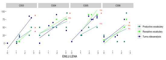 The analysis revealed three significant results: (1) a positive correlation between the EMLU found in LENA and the one from the video analysis; (2) a positive correlation between EMLU.LENA, the receptive vocabulary, and vocal conversational turns in three out of four participants; (3) the conversational turn count in video analysis as a marginally significant predictor for Productive vocabulary; (4) the EMLU estimated from video analysis as a significant predictor for Receptive vocabulary. Our findings are consistent with those of Tait, Lurman, and Robinson [13], who found a positive correlation between the number of turn-takings and later language outcomes, as well as with previous literature on the positive correlation between EMLU and language abilities [18].