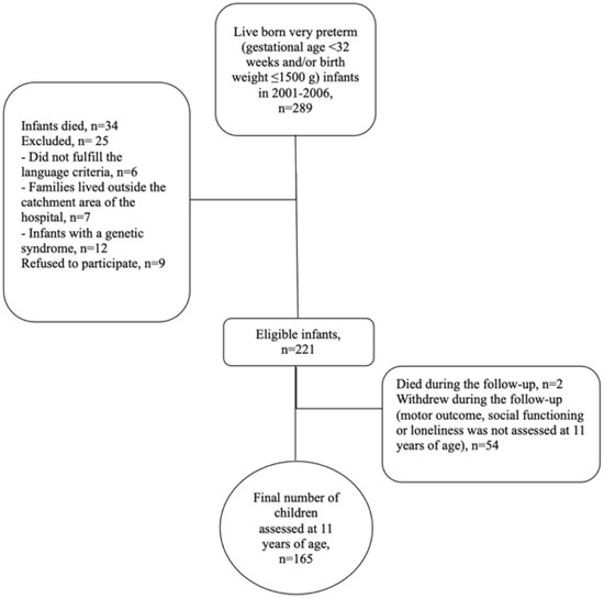 This study is part of the Finnish prospective multidisciplinary PIPARI Study (The Development and Functioning of very low weight infants from Infancy to School Age). The participants were born to Finnish- or Swedish-speaking families in the Turku University Hospital between 2001 and 2006. The inclusion criteria were birth weight ≤ 1500 g and gestational age < 37 weeks. From the beginning of 2004, the inclusion criteria were expanded to include all infants born < 32 gestational weeks, despite the birth weight. In addition, the participants in the present study had to have the following evaluations at 11 years of age (1) Movement Assessment Battery for Children—Second Edition (Movement ABC-2) [36] for motor outcome, (2) Peer Network and Dyadic Loneliness scale (PNDL) [28,37] for perceived loneliness, and (3) Multisource Assessment of Children’s Social Competence Scale (MASCS) [38,39] for perceived social competence. Information about the children’s clinical diagnosis were collected from families during the study visit and from medical records. The flowchart of the participants is shown in Figure 1.