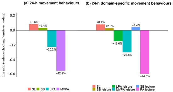 Geometric mean bar plot on log-ratios between compositional means while online-schooling and onsite-schooling conditions for (a,b). For example: geometric mean bar plot (a) indicates that on average students spent more time in SL (+8.6%) and SB (+3.4%), and less time in LPA (−20.2%) and MVPA (−42.2%) on days when they attended lectures from home (online) compared to when they attended lectures from school (% were calculated as: exp of log ratio × 100–100). Abbreviations: SL, sleep; SB, sedentary behaviour; LPA, light physical activity; MVPA, moderate-to-vigorous physical activity; PA, physical activity.