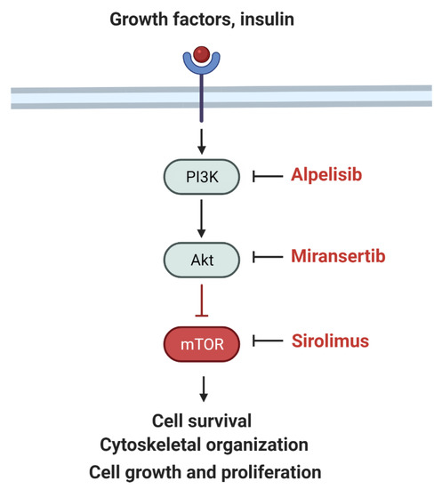 Simplified schematic of the PI3K signaling pathway and inhibitors including alpelisib (PI3K inhibitor), miransertib (AKT inhibitor), and sirolimus (MTOR inhibitor). Adapted from “mTOR signaling pathway” by BioRender.com (2022). Retrieved from https://app.biorender.com/biorender—accessed on 15 March 2022.