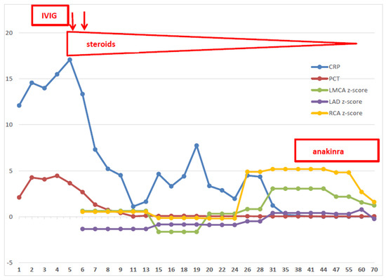 Time course of C-reactive protein, Procalcitonin, coronary arteries and treatments. CRP = C-reactive protein; PCT = procalcitonin; LMCA = left main coronary artery; LAD = left anterior descending artery; RCA = right coronary artery; IVIG = intravenous immunoglobulins.