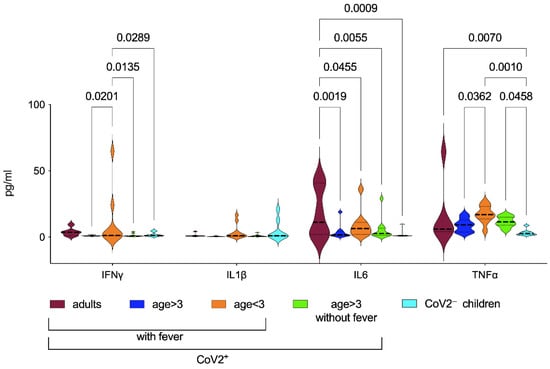 Serum cytokine levels. Cytokine levels were measured in sera samples of patients at data entry, using ELLA Assay (Biotechne, both from R&D Systems). Violin plots compare CoV2 infected groups based on age at onset and the symptom of the fever. Our cohort did not comprise CoV2+ adults neither CoV2+ children younger than 3 years without fever. Age cut off is described in the method section. Statistical analyses were performed with a two-way ANOVA corrected with Tukey. IFNγ: Interferon-γ, IL6: Interleukin 6, IL1β: interleukin 1 β and TNFα: tumor necrosis factor α.