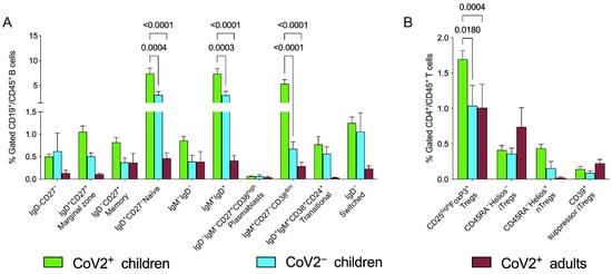B cell subpopulations were analyzed taking into consideration the expected numbers/percentages based on the reference ranges for sex and age [,] and for children in comparison with the control group. Adults and children showed perturbed distributions of B cell subsets at data entry (Figure 2A); specifically, higher frequencies in the CoV2+ children, compared to both CoV2− group and CoV2+ adults, were present in IgD+CD27− naïve B cells, IgD+IgM+ and IgM+CD27−CD38dim B cells as detailed in Figure 2 Statistical significances were determined using two-way ANOVA corrected with Tukey, where each p value was adjusted to account for multiple comparisons as shown in Table 3.
