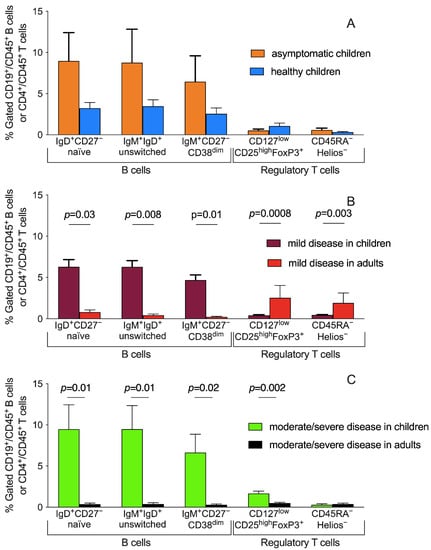 Similarly, with cytokine levels, a heterogeneous distribution of B cells and Tregs subsets was detectable among patients based on disease severity. No differences in distributions of B cells and Tregs subsets are detectable comparing asymptomatic CoV2 positive and negative children (Figure 3A). The comparison of patients with mild disease severity (children vs. adults) showed significant differences in IgD+CD27− naïve B cells, IgD+IgM+ unswitched, and IgM+CD27−CD38dim B cells (p = 0.03, p = 0.008, and p = 0.01, respectively) suggesting a potential role of these subpopulations specifically during mild childhood infection (Figure 3B). Conversely, the T regulatory compartment was consistently expanded more in adults with a mild symptomatology than children (p = 0.0008 and p = 0.003 for total (CD25highFoxP3+) and inducible (CD45RA−Helios−) Tregs, respectively). On the contrary, for patients with a moderate/severe outcome, despite similar significant percentages of B cells described above for patients with mild severity, we observed an opposite distribution of Tregs subsets, higher in children than adults (Figure 3C).