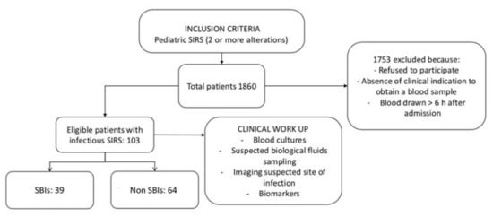 The strengths of this study include the prospective design and the evaluation of some biomarkers that had never been tested before in pediatric patients with SIRS. Furthermore, only a few studies have evaluated biomarkers for the diagnosis of SBIs, while the majority are focused only on the occurrence or the severity of sepsis. However, some limitations need to be pointed out. The study was conducted in two different real-life settings, the emergency department and the oncology ward. For this reason, we performed a separate analysis on non-immunocompromised patients (i.e., most patients presenting to the emergency department) to avoid possible biases due to immune suppression.