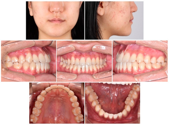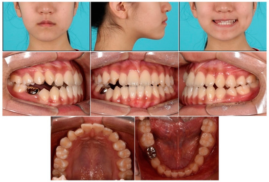 During clinical examination of the patient, a straight face was observed on the frontal extraoral photograph (Figure 1). Intraoral examination showed a crossbite in the maxillary right lateral incisor, and the overjet and overbite were both 1.0 mm with no functional shift (Figure 1). The midline of the maxillary and mandibular dentitions deviated by 1 mm to the left and right, respectively, compared to the facial midline. During smiling, a lateral open bite in the right premolar area was identified. Retained maxillary and mandibular primary second molars were also noted. The maxillary and mandibular arch length discrepancies were 1.5 and 0.5 mm, respectively.