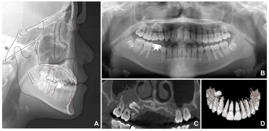 Pretreatment radiographs: (A) lateral cephalogram; (B) panoramic radiograph; (C,D) cone beam computed tomography.
