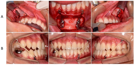 Insertion and use of the miniplate: (A) surgery for miniplate insertion; (B) use of Class III inter-maxillary elastics.