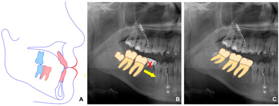 Schematic diagram related to protraction of the mandibular right posterior teeth. (A) Virtual treatment objective image. Blue and red lines are before and after treatment, respectively. (B) The protraction of the mandibular right first and second molars to the position where the right primary second molar was extracted. The yellow arrow represents the direction of tooth movement. X indicates extracted tooth. (C) Eruption of the mandibular third molar to the natural occlusal plane because of the anterior movement of the mandibular right molars.