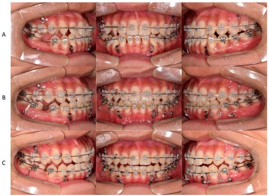 Nonsurgical orthodontic treatment process using a fixed appliance. (A) space regaining for maxillary right lateral incisor arrangement after bonding the fixed appliance. (B) Closing the mandibular extraction space using the miniplate anchorage, moving the maxillary midline to the right, and moving the mandibular midline to the left. (C) The mandibular extraction space was closed.