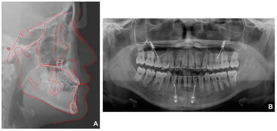 Radiographs after debonding: (A) lateral cephalometric radiographs; (B) panoramic radiograph.