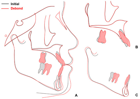 Superimposition before and after treatment: (A) total; (B) maxilla; (C) mandible.