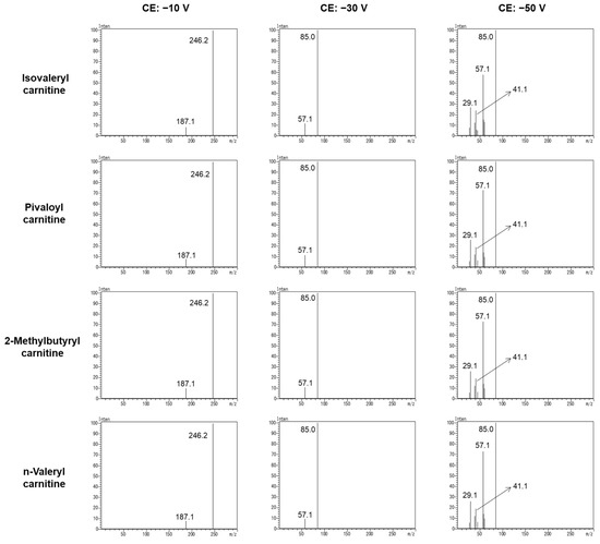 Although isomers of C5-acylcarnitine (i-C5, p-C5, m-C5, and v-C5) had different terminal structures in the acyl chain (Figure 1), these isomers could not be distinguished by the conventional FIA-TMS method. Therefore, we screened specific product ions that were generated from the acyl chain to distinguish i-C5 from other isomers. Figure 2 shows the product ion spectra of these isomers when the CE was set at −10, −30, or −50 V. Typical product ions of m/z 187.1, 85.0, 57.1, 41.1, and 29.1 were detected for all isomers. The specific product ion of these isomers of C5-acylcarnitine was not generated. This revealed that these isomers cannot be distinguished by the specific product ion.
