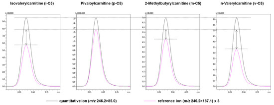 In MRM mode, the reference ion is used for identifying the molecule in addition to the quantitative ion for quantification. We found that the intensity of the reference ion relative to the quantitative ion was different for each isomer. Therefore, we investigated the reference ion ratios (the ratio of the peak intensity of the reference ion to the quantitative ion) for each isomer in various CEs. As shown in Figure 2, in order of peak intensity, m/z 246.2 > 85.0 (CE: −23 V) and m/z 246.2 > 187.1 (CE: −15 V) were determined as the quantitative ion and reference ion, respectively. The other ions (m/z 57.1, 41.1, 29.1) were not appropriate as product ions in terms of peak intensity and reproducibility. MRM chromatograms of i-C5, p-C5, m-C5, and v-C5 are shown in Figure 3. The results of continuous analyses (n = 6) revealed that the reference ion ratios of i-C5, p-C5, m-C5, and v-C5 were 19.97 ± 0.61%, 27.25 ± 0.56%, 22.89 ± 0.43%, and 18.07 ± 0.77%, respectively. There was no significant difference in the reference ion ratios for i-C5, m-C5, and v-C5, but the reference ion ratio for p-C5 was higher than that of the other isomers, suggesting that p-C5 could be distinguished from the other isomers by its reference ion ratio. Normally, most of the increased C5-acylcarnitine in NBS is due to i-C5 and sometimes to p-C5. It is very rare that the differentiation of m-C5 or v-C5 becomes a problem [25], and their identification is not important for the initial test. Therefore, we examined whether the similarity of the reference ion ratios of i-C5 and p-C5 could be used as an index to estimate which of the two was dominant in C5 in the sample. Similarities of the reference ion ratio of i-C5 and p-C5 were described as the i-C5 score and p-C5 score by the following equation: