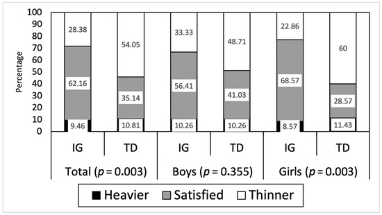 In general, around 62% of the IG participants were satisfied with their body image, while only 35% of typical development participants shared this opinion. These differences in body satisfaction were striking in the case of the girls (68.5% vs. 28.5%) (Figure 1).