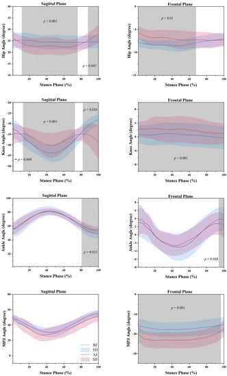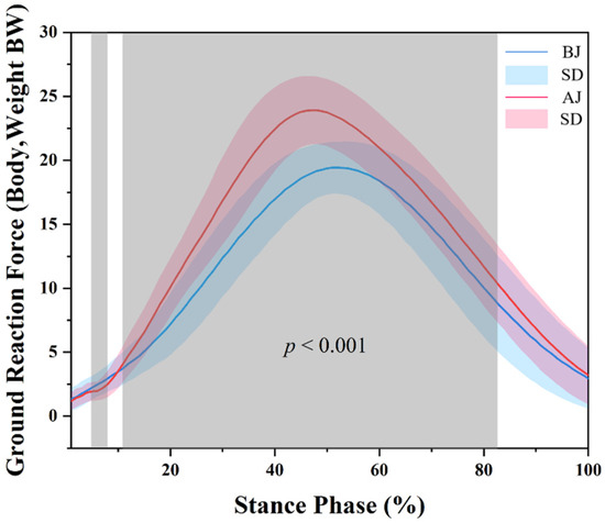 The results of kinetics are shown in Figure 4. SPM analysis revealed that BJ had a significantly greater VGRF than AJ during the 4–7% (p = 0.047) and a significantly smaller VGRF than AJ during the 11–82% (p < 0.001).