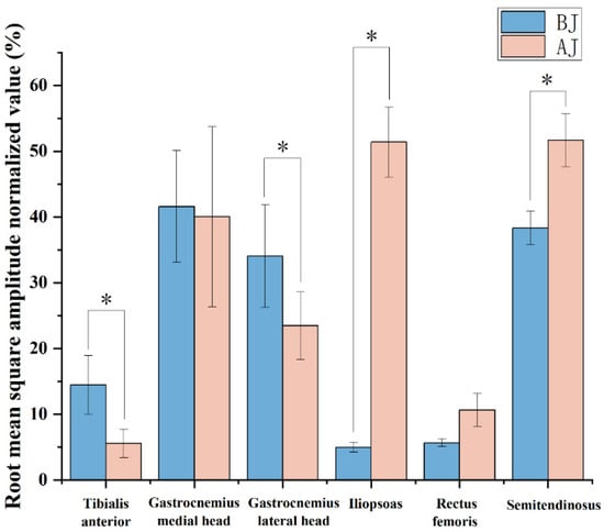 During the whole lower limb ground-contact phase of rope skipping, the root mean square amplitude normalization value and standard deviation of each muscle of lower extremities with different rope skipping methods are shown in Table 2 and Figure 5. The results showed that the standardized value of EMG RMS amplitude of tibialis anterior during BJ was 14.46 ± 4.45%, and AJ was 5.57 ± 2.15%, which was significantly higher than that of AJ (p = 0.001). The standardized value of EMG RMS amplitude of gastrocnemius lateral head during BJ was 34.05 ± 7.79%, and AJ was 23.49 ± 5.14%, significantly higher than AJ (p = 0.026). The normalized value of root mean square amplitude of iliopsoas during BJ was 5 ± 0.756%, and AJ was 51.38 ± 5.317%, which was significantly lower than AJ (p = 0.001). The standardized value of the root mean square amplitude of semitendinosus during BJ was 38.33 ± 2.52%, and AJ was 51.67 ± 4.04%, significantly lower than AJ (p = 0.015). There was no significant difference between BJ and AJ in the EMG results of the other two muscles.