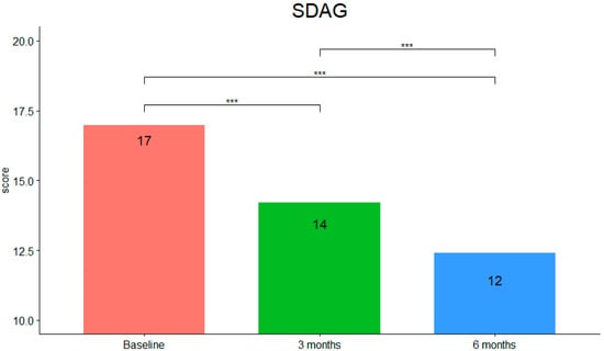 SDAG scores (see Figure 4) showed that they were statistically significantly different at the different time points during tPBM intervention (F (2,40) = 39.966, p < 0.001, η2g = 0.574). Pairwise comparisons using the Bonferroni correction showed that there was a decrease in SDAG scores from pre-intervention to three months (p < 0.001) and from pre-intervention to six months (p < 0.001) as well as from three to six months (p < 0.001).