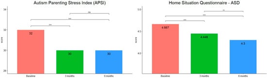 Median scores of HSQ-ASD and ASPI at the three timepoints (***: p-value < 0.001; **: p-value < 0.01; ns, not significant).