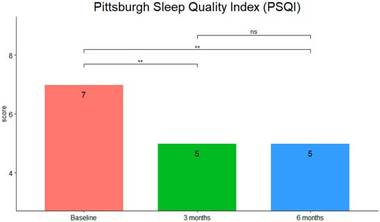 Median scores of PSQI at the three timepoints (**: p-value < 0.01; ns, not significant).