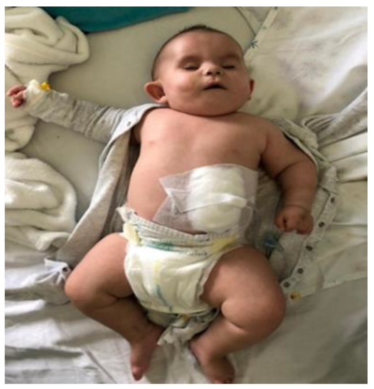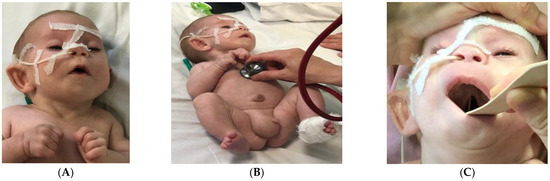 In May 2019, at the age of two months, the infant was admitted to the Pediatrics Department of the “Grigore Alexandrescu” Emergency Hospital for Children in Bucharest for feeding difficulties and growth failure. Clinical examination at admission revealed a dystrophic infant (weight 2710 g, Z score −3.12) with facial dysmorphism (hypertelorism, microphthalmia, eyelid ptosis, mongoloid slant and bilateral blepharophimosis, anteverted nostrils, long philtrum, micrognathia, and low-set dysplastic posteriorly rotated ears) and other constitutional anomalies (presacral fossa, cleft palate, clinodactyly of the fifth finger of both hands, abnormally implanted toes, and syndactyly of the third and fourth toes of the left foot). Umbilical and right inguinoscrotal hernias were also observed (Figure 2 A–C).