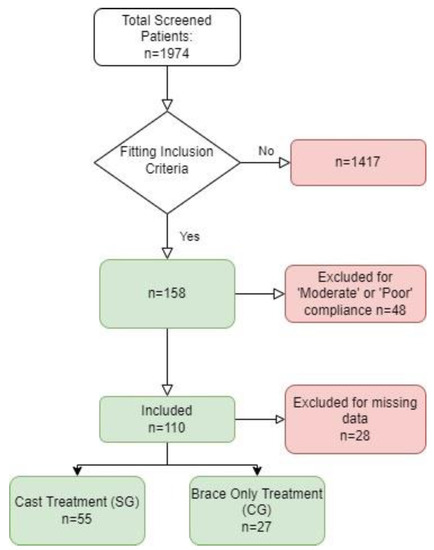 The study was performed in March 2022; through an Institutional Database search, we identified all the patients treated at our institution between 1 January 2017 and 31 December 2020 that matched the inclusion criteria and retrieved all their medical records. Patients with incomplete medical records were contacted and asked to provide the missing documentation. Each patient was asked whether they underwent spinal fusion at other institutions. On the basis of the medical records, patients were divided in two groups: the Study Group (SG), which included patients who underwent seriate Risser casting followed by brace treatment, and the Control Group (CG), which included patients who underwent treatment with only a brace.