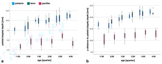 (a) Palatal depth index, a dimensionless parameter of the ratio of pd to y-pd, with no meaning for growth. Pacifier scores are significantly smaller than infant scores, except in quarter 3, and are only related to preterm infants. (b) Palatal width index as a ratio of pw to y-pw. Here, the pacifier values are significantly larger, except in quarter −1. (*) extreme outlier.