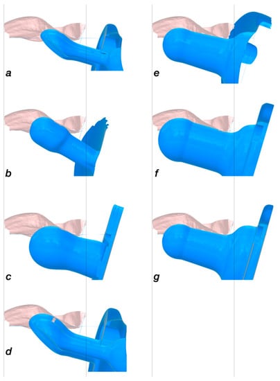 A further reference is the soft tissue thickness below the contact surface of the lip shield. McKinnon et al. revealed that the soft tissues of the lips are significant correlated to most cranial dimensions [30]. This means that lip thickness increases with growth and, depending on age, the intraoral position of the pacifier’s artificial nipple changes. An upper lip thickness of 6.6 ± 0.3 mm for female newborns and 7.0 ± 0.4 mm for male newborns was reported. Within the first year, the lip thickness increases by 0.7 mm [30]. With these three references, the pacifiers were oriented in the median plane to the palates. In the vertical plane, the pacifiers were positioned until the first palatal contact.
