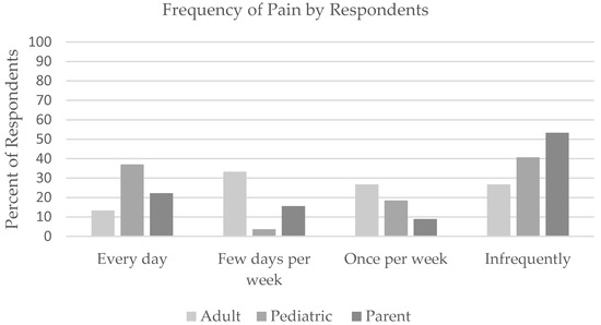 Ratings of pain frequency as reported by adult and pediatric self-report population, and parents of pediatric MTC patients of all ages. Pediatric self-report n = 27; parent report n = 45 Adult self-report n = 15.
