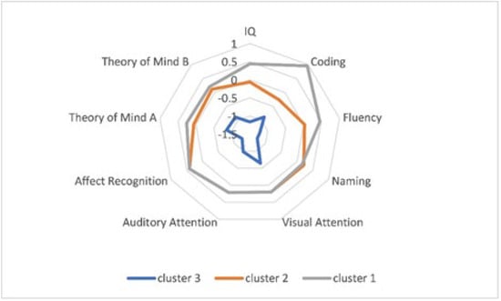 We evaluated the clusters and determined that the three clusters could be described as follows: clusters 1 and 2, which respectively account for 35% and 48% of the sample, reflect normal global functioning, with cluster 1 showing more intra-individual variability and better performances only in IQ and executive functioning. The third group, which represented 17% of the sample, included children with poor performance in multiple domains.