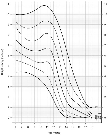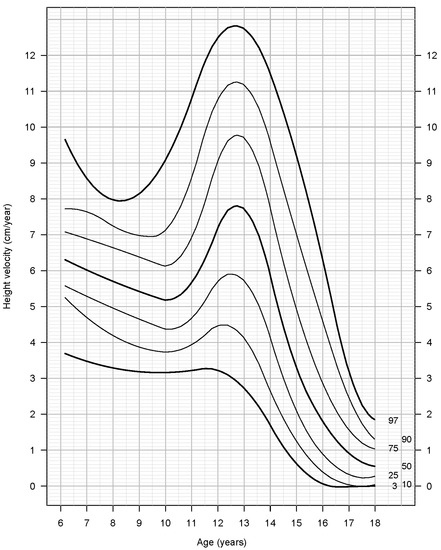 - Kelly, A.; Winer, K.K.; Kalkwarf, H.; Oberfield, S.E.; Lappe, J.; Gilsanz, V.; Zemel, B.S. Age-based reference ranges for annual height velocity in US children. J. Clin. Endocrinol. Metab. 2014, 99, 2104–2112. [Google Scholar] [CrossRef]